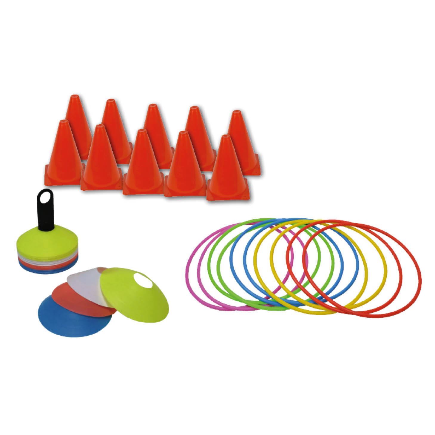 Set bestaande uit: set van 40 markeerschijven - 10 ronde hoepels (dia 65cm) - 10 standaard kegels van 23cm